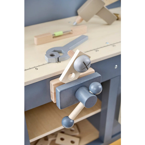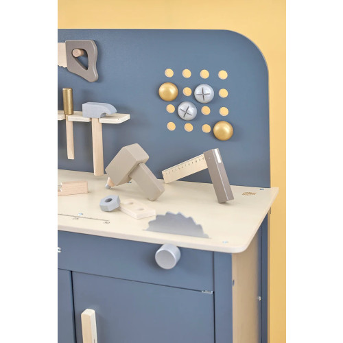 Houten Jabadabado werkbank voor kinderen vanaf 3 jaar. CE-gemarkeerd en FSC™-gecertificeerd, uitgevoerd in grijs en ideaal voor creatief en fantasierijk rollenspel.
