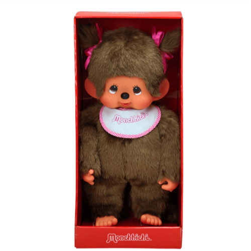 Groot Monchhichi-meisje van 45 cm met roze slab. Pluche/vinyl klassieker uit Japan, geschikt vanaf 2 jaar. Ideaal voor fans en verzamelaars. Verkrijgbaar bij ToysGarden, Nijmegen.
